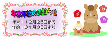 年末年始は、令和7年12月27日(土)から令和8年1月4日(日)まで休業とさせていただきます。